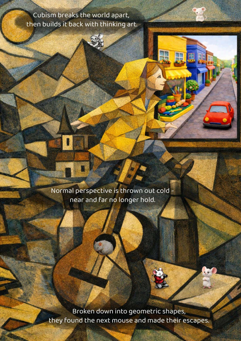 They are transformed into 12 different art styles on their journey, as they learn fascinating facts about each style. From oil to watercolour, cartoons to cubism, our hero must find each style of mouse and bring them safely home.
